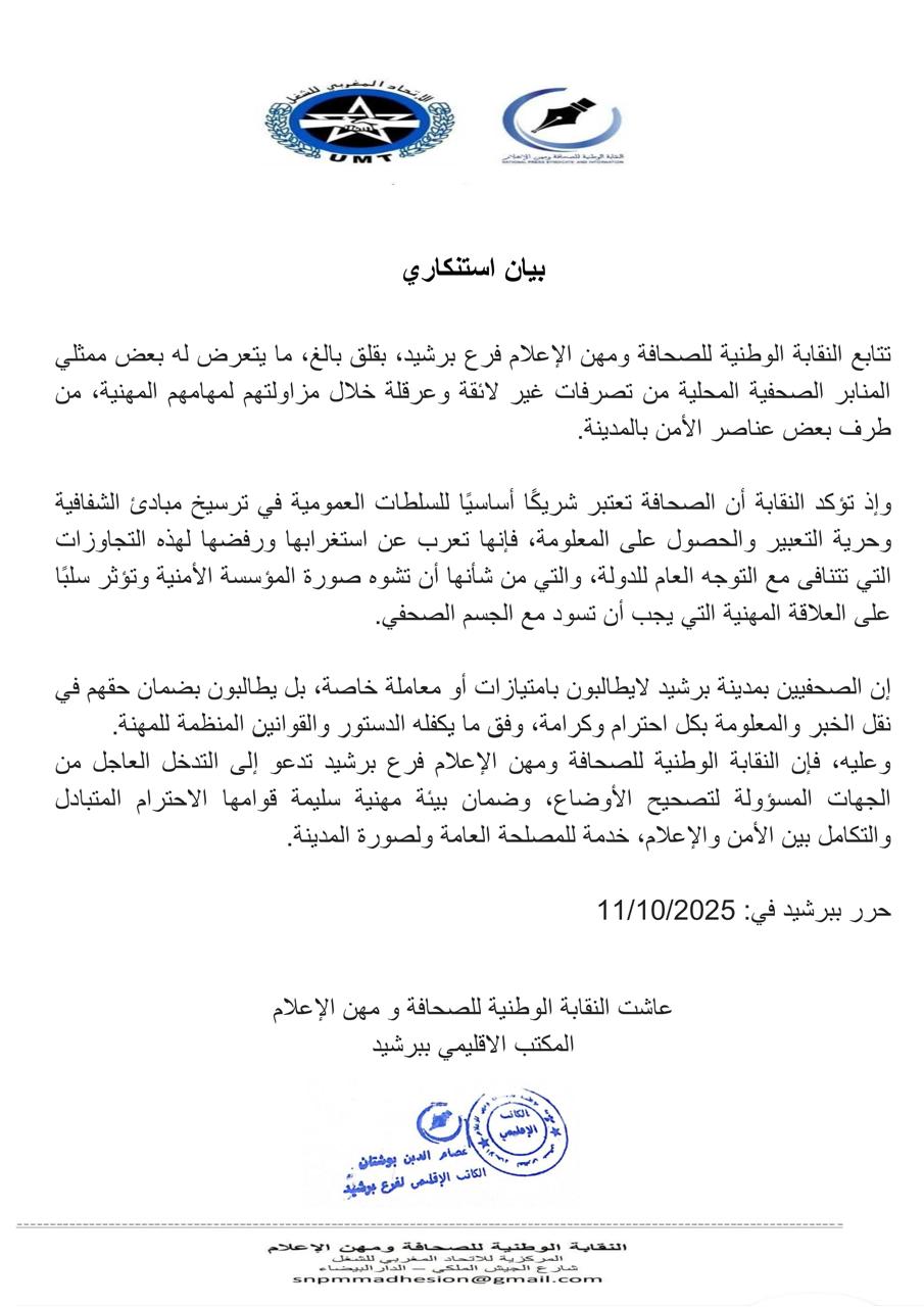 بيان استنكاري صادر عن النقابة الوطنية للصحافة ومهن الإعلام – المكتب المحلي لبرشيد