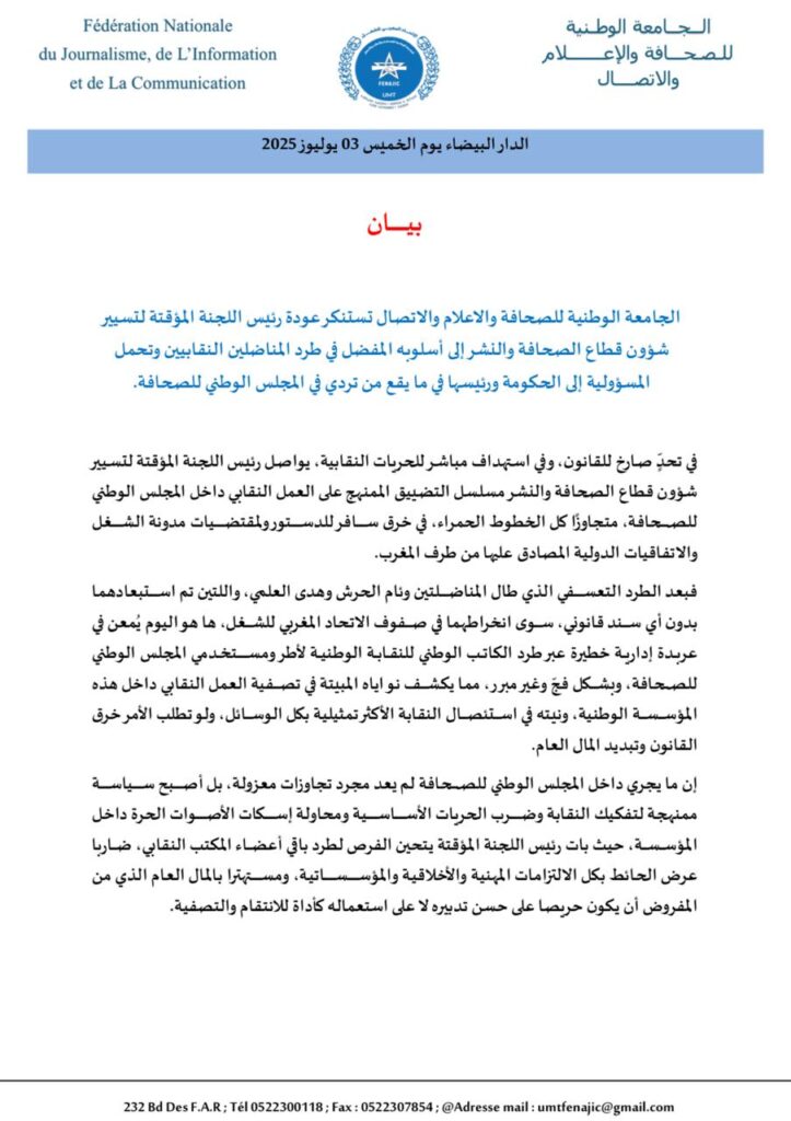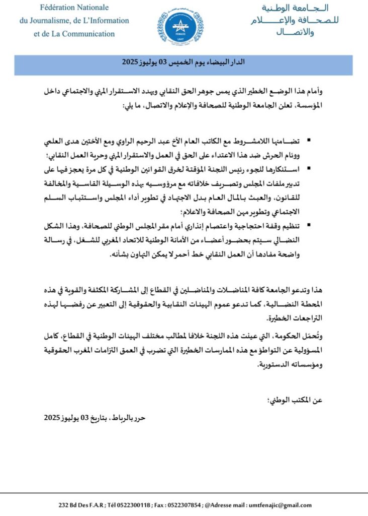 في النهاية، يفتح هذا البلاغ النقابي نقاشًا عريضًا حول أزمة تدبير القطاع الإعلامي بالمغرب، ومستقبل المجلس الوطني للصحافة، الذي لم ينجح حتى الآن في تجاوز أزماته الداخلية وتجديد هياكله بما يعيد الثقة لأطره ويحصّن استقلالية الصحافة المغربية.