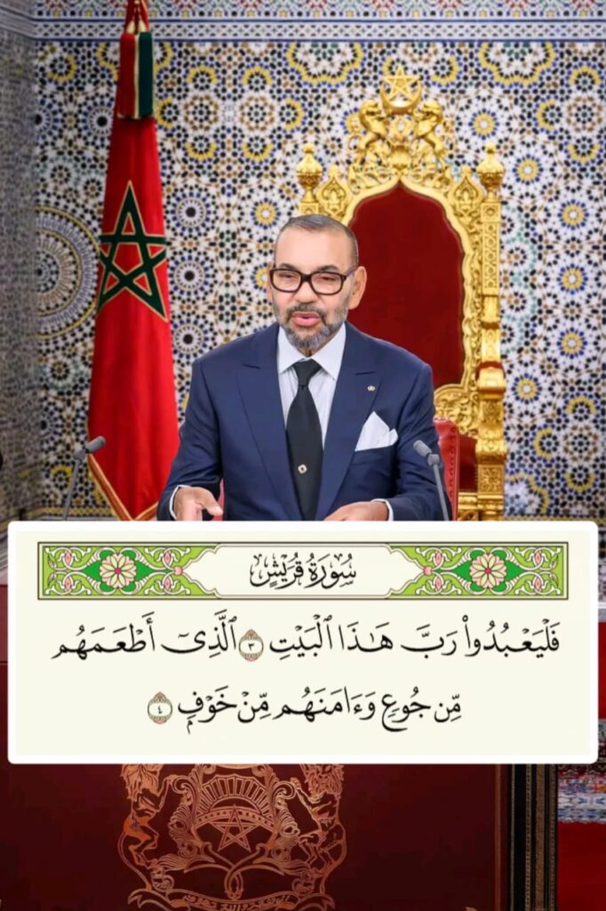 في ختام خطابه السامي بمناسبة عيد العرش المجيد، اختار الملك محمد السادس ان يختم كلمته بآية قرآنية من سورة قريش ، قوله تعالى “فليعبدوا رب هذا البيت الذي اطعمهم من جوع وآمنهم من خوف ” ، وهي ليست مجرد خاتمة دينية عابرة، بل تذكير صريح وعميق بمصدر النعم وسبيل حفظها، ودعوة ضمنية الى الالتزام بالمسؤولية والعدل قبل المطالبة بالتنمية والاستقرار.