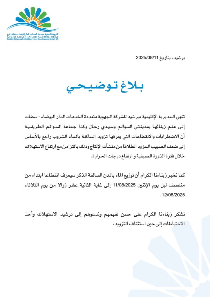 أعلنت المديرية الإقليمية ببرشيد للشركة الجهوية متعددة الخدمات الدار البيضاء – سطات، في بلاغ توضيحي توصلت جريدتنا به، أن مدينتي السوالم وسيدي رحال، إضافة إلى جماعة السوالم الطريفية، ستعرف اضطرابات وانقطاعات في تزويد الساكنة بالماء الشروب، نتيجة ضعف الصبيب المزود من منشآت الإنتاج، بالتزامن مع الارتفاع الكبير في الاستهلاك خلال فترة الذروة الصيفية، وارتفاع درجات الحرارة.