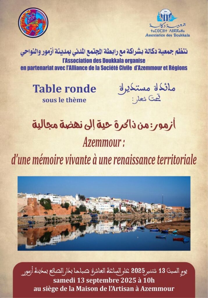تعيش مدينة أزمور على وقع استعدادات حثيثة لاحتضان حدث مدني بارز، يوم السبت 13 شتنبر 2025، حيث تنظم جمعية دكالة بشراكة مع رابطة المجتمع المدني بأزمور والنواحي مائدة مستديرة تحت شعار: