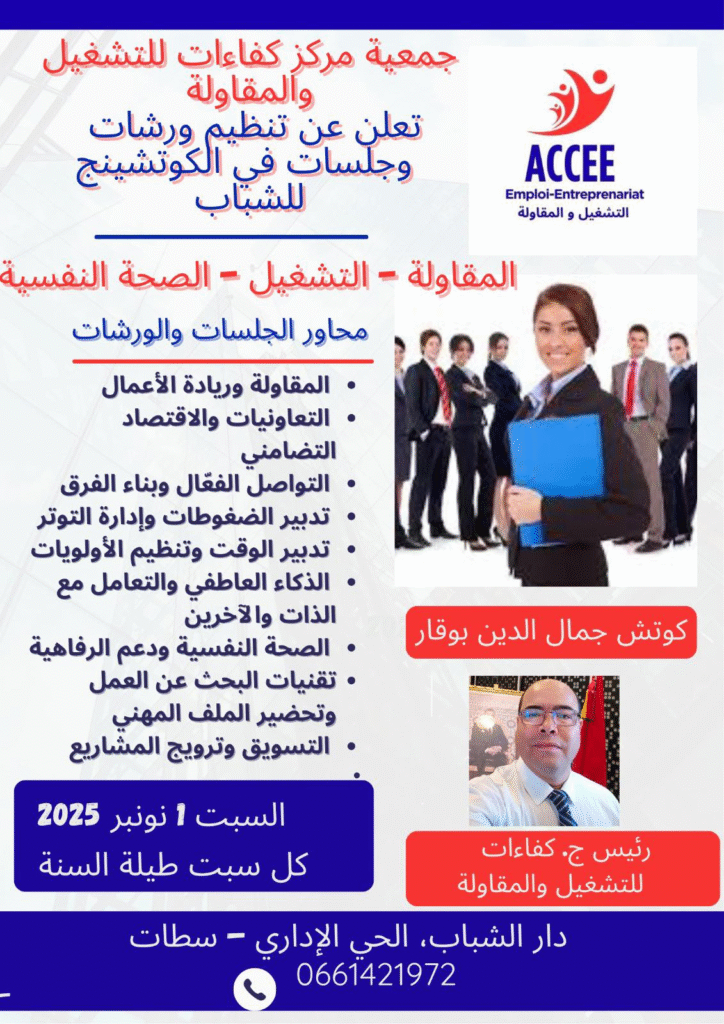 في إطار دينامية المجتمع المدني الهادفة إلى دعم وتأهيل الشباب، أعلنت جمعية مركز كفاءات للتشغيل والمقاولة عن إطلاق سلسلة من الورشات والجلسات التدريبية في مجال الكوتشينغ، موجهة لفائدة الشباب وقادة المستقبل بمدينة سطات، وذلك ابتداءً من السبت 1 نونبر 2025 بدار الشباب بالحي الإداري.