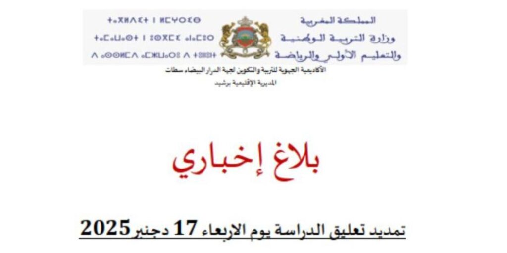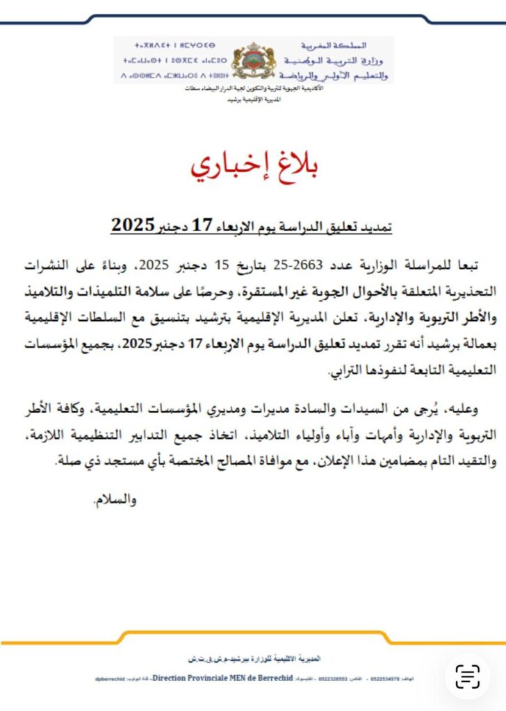 في إطار التدابير الاستباقية الرامية إلى ضمان سلامة التلميذات والتلاميذ وكافة الأطر التربوية والإدارية، أعلنت المديرية الإقليمية لوزارة التربية الوطنية ببرشيد، بتنسيق مع السلطات الإقليمية بعمالة برشيد، عن تمديد تعليق الدراسة يوم الأربعاء 17 دجنبر 2025 بجميع المؤسسات التعليمية التابعة لنفوذها الترابي.