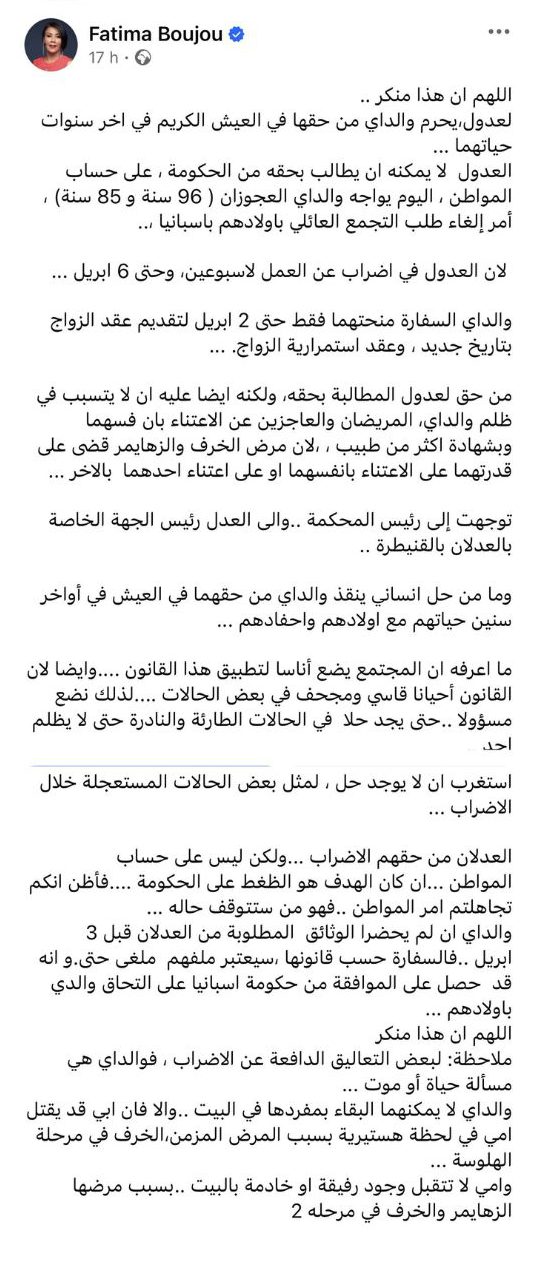 وروت بوجو تفاصيل الوضع الصحي لوالديها، اللذان يرغبان في الالتحاق بأبنائهم بالديار الإسبانية والمشكل الكبير الذي يواجههما بسبب إضراب العدول، الذي سيستمر إلى ما بعد المهلة التي أعطتها السفارة لوالديها من أجل الإدلاء بعقد زواجهما، مدونة “اللهم إن هذا منكر .. لعدول، يحرم والداي من حقها في العيش الكريم في اخر سنوات حياتهما … العدول لا يمكنه ان يطالب بحقه من الحكومة، على حساب المواطن، اليوم يواجه والداي العجوزان ( 96 سنة و 85 سنة)، أمر إلغاء طلب التجمع العائلي بأولادهم بإسبانيا،.. لأن العدول في إضراب عن العمل لاسبوعين، وحتى 6 أبريل … “.