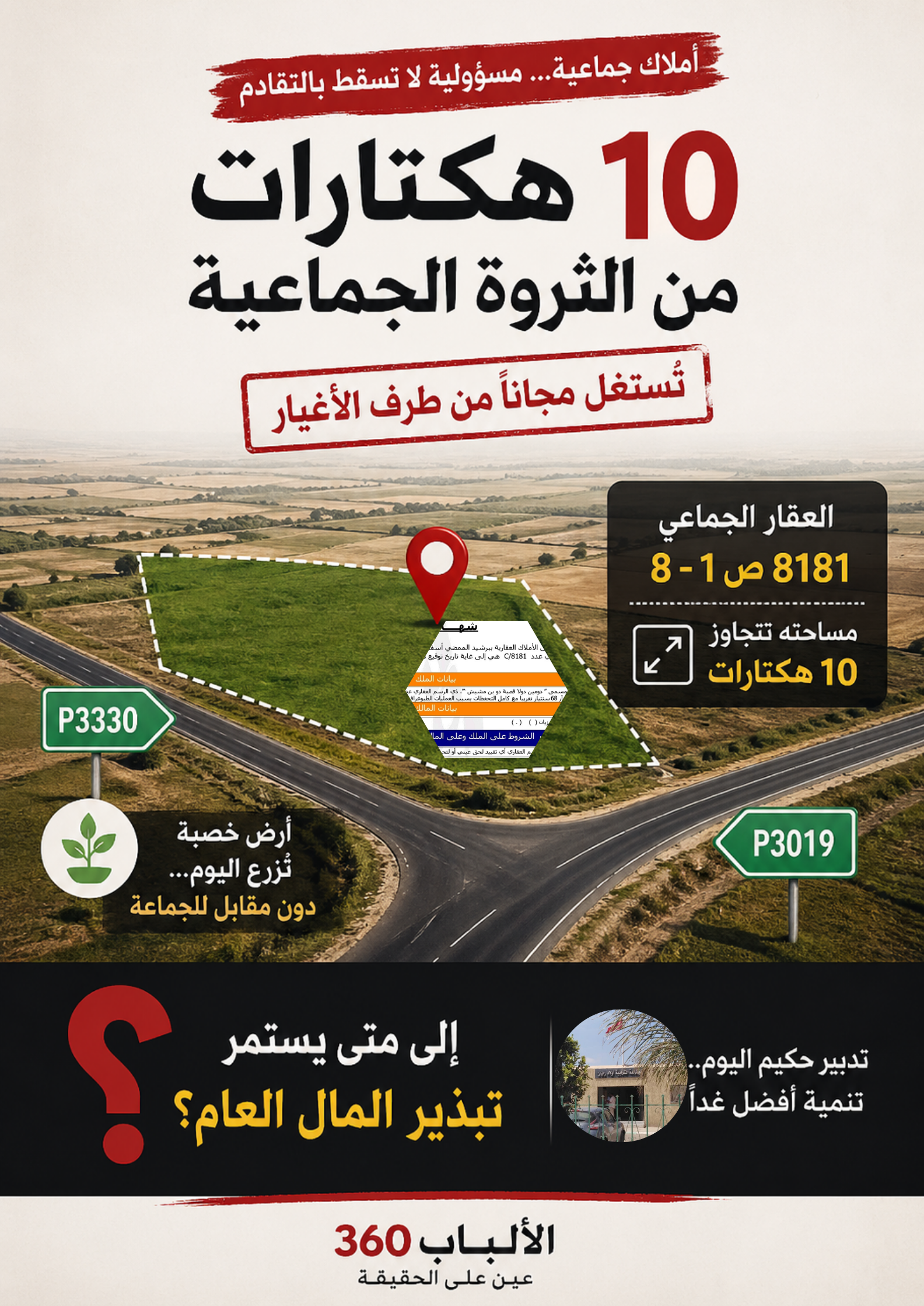 ومن بين النماذج التي تثير الكثير من علامات الاستفهام، يبرز العقار الجماعي ذي الرسم العقاري 8181 / C، الذي تتجاوز مساحته عشرة هكتارات، والمتموقع في نقطة استراتيجية بالغة الأهمية عند ملتقى الطريقين الإقليميين P3330 وP3019، وهو موقع يمنحه قيمة عقارية واستثمارية معتبرة، كان من المفترض أن يشكل موردًا مالياً مهمًا لفائدة ميزانية الجماعة.